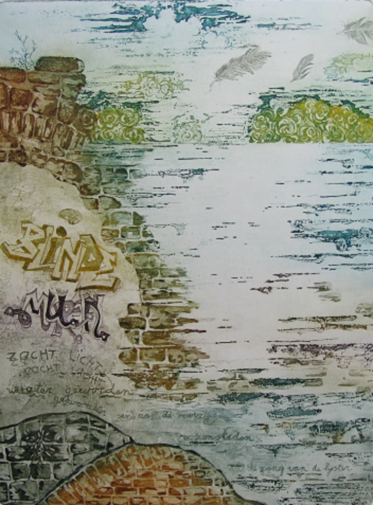 Ook deze ets is geïnspireerd door een lied van Huub Oosterhuis. Als ik de laatste regels van het lied zing, krijg ik nog steeds de rillingen. Wat een vredesvisioen! Blinde muren zacht licht water geworden, luidt het. Dichtgemetselde muren, doorgangen, met graffiti bespoten. Voor mij het beeld van troosteloosheid, uitzichtloosheid. Potdicht. Maar zie: zacht licht water stroomt langs de muren. De zon strijkt over het water en aan de overzijde, de horizon, bloeien rozensteden, plek van liefde en liefhebben. En je hoort er de zang van de lijster, gesymboliseerd door een verwaaiende veer....... Voor mij het ultime geloof, dat het allemaal goed komt en dat er ondanks alles een andere wereld zal komen, een wereld van gerechtigheid. Dit is de tweede staat, met een oplage van 50.
