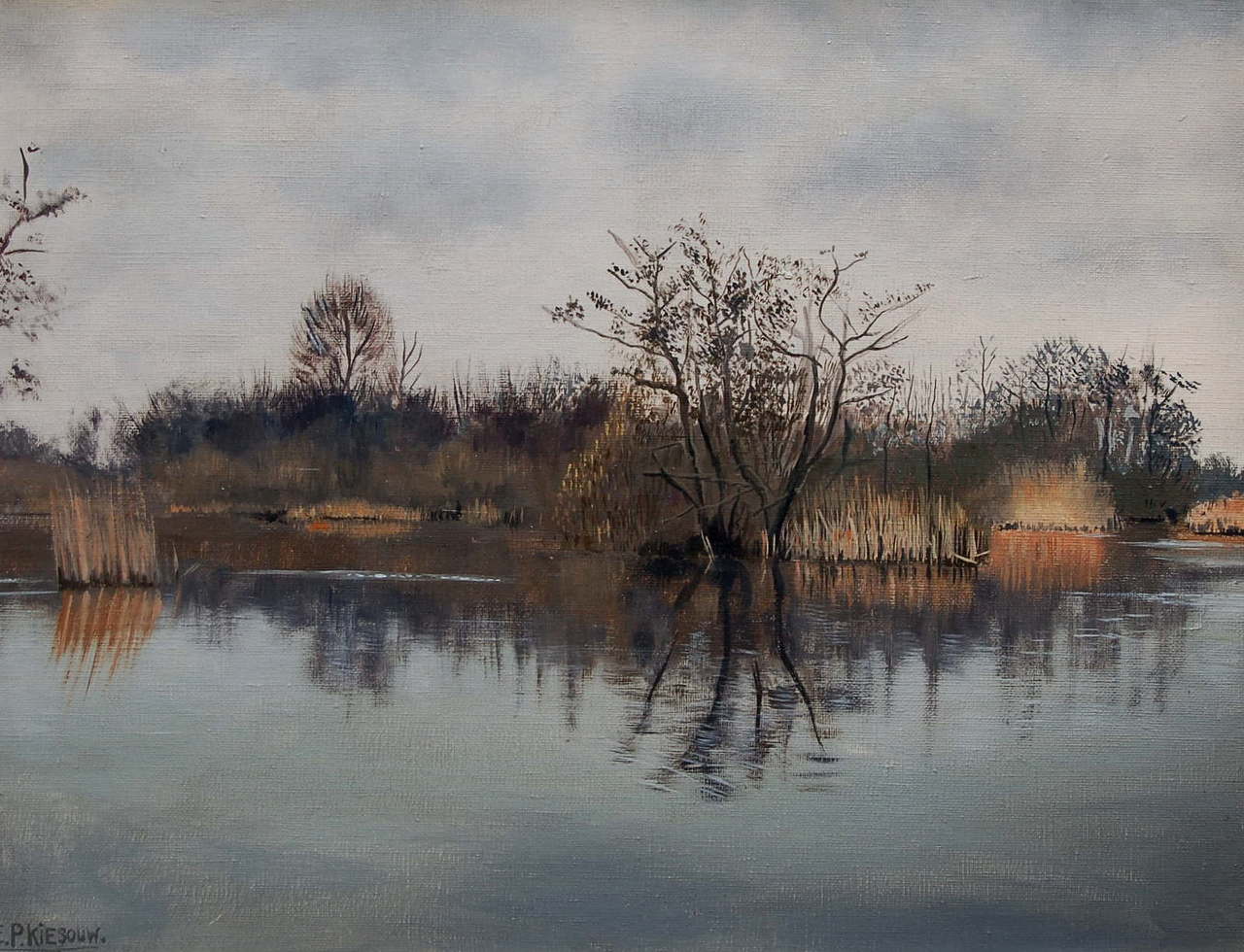 Water impressie met elzen moerasstruiken en riet.