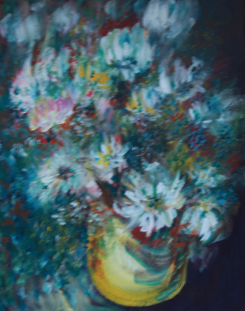 bloemen als opgaande streepjes wat in het geheel een bos in pot vormt