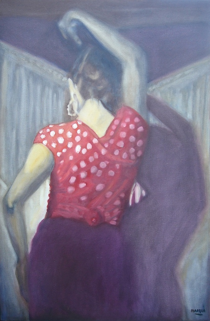 Flamenco danseres rug geschilderd in olieverf op linnen doek 80x120x4 cm. In zwart wit rood.