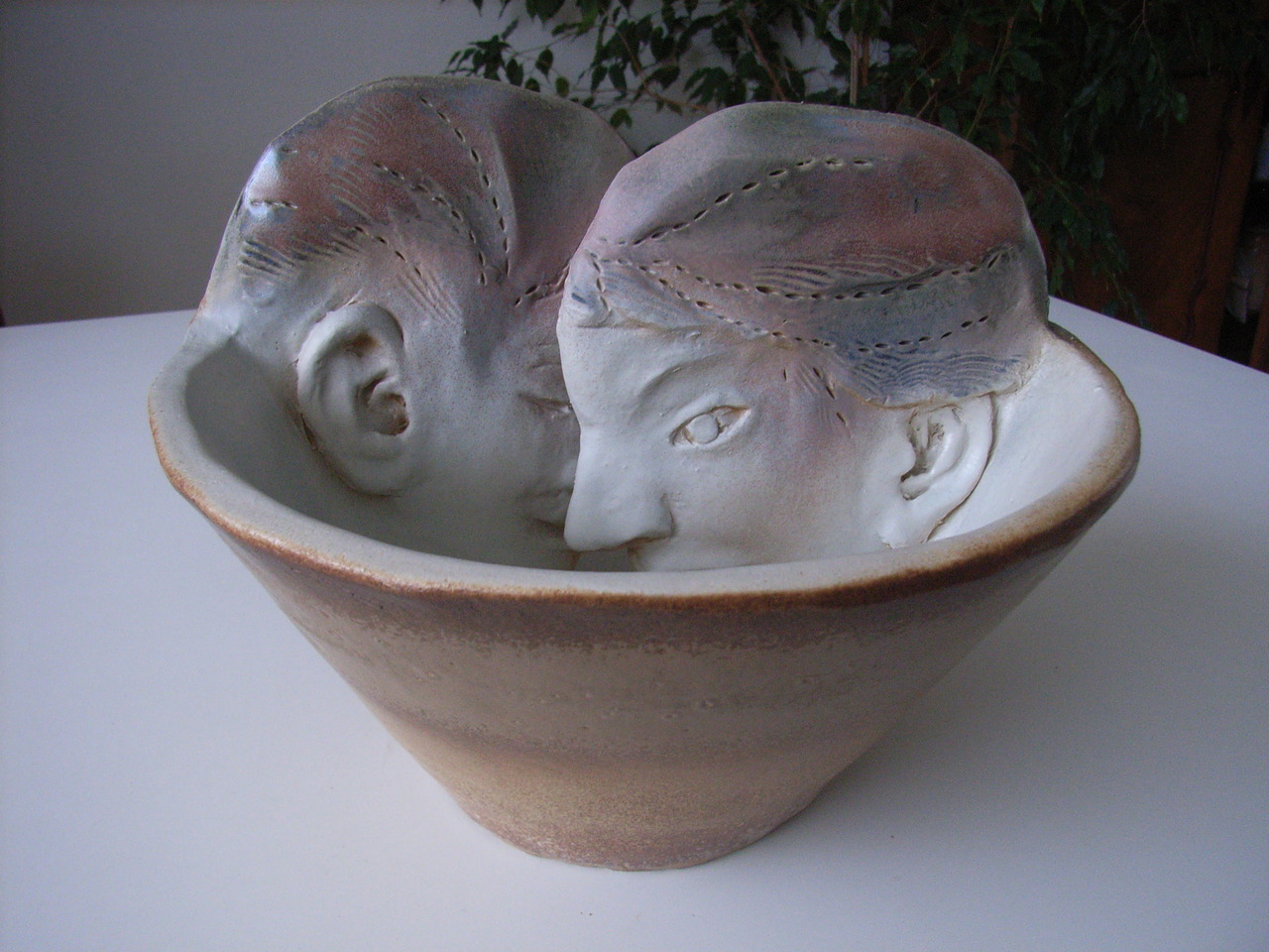 Koffiekop, steengoed, met twee hoofden van een man en een vrouw.