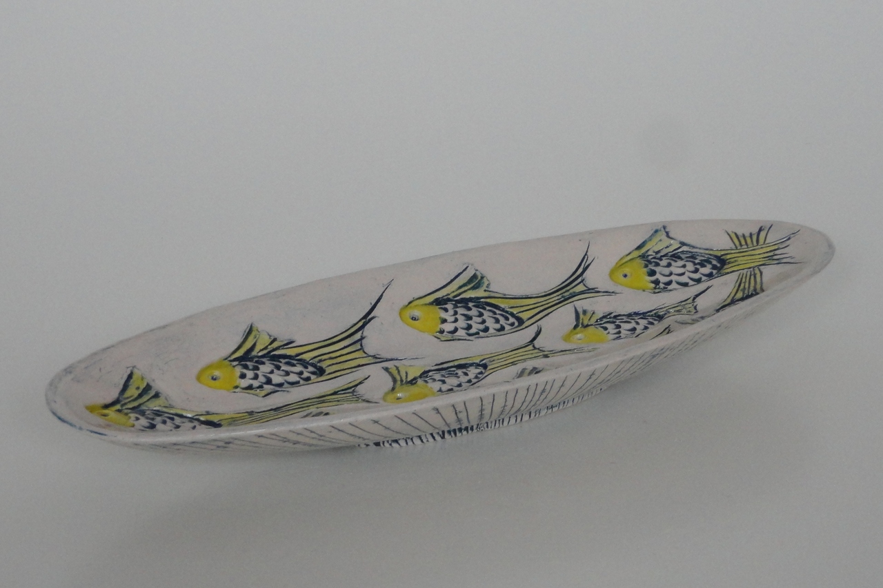 ovale schaal met vismotieven in relief
