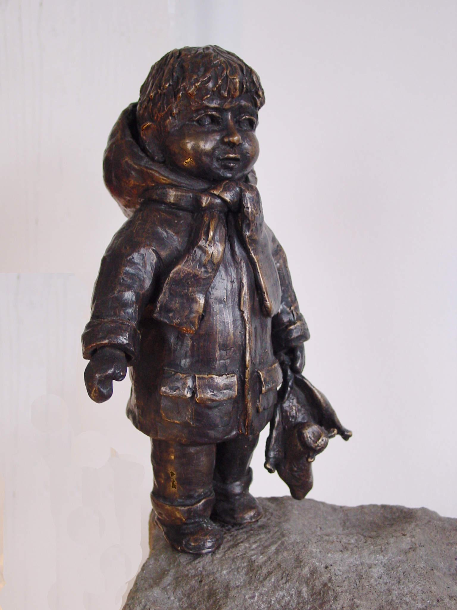 Bronzen beeld van kleine jongen die zijn eerste stappen in de sneeuw zet. Prijs op aanvraag.