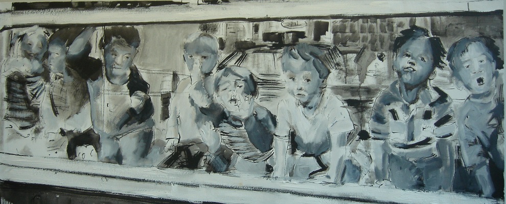 Kinderen achter een raam (B.S.O. naschoolse opvang). Geschilderd met Oost-Indische inkt met rietpen en penseel aangevuld met zwart-witte olieverf op doek 50x120x4 cm.
