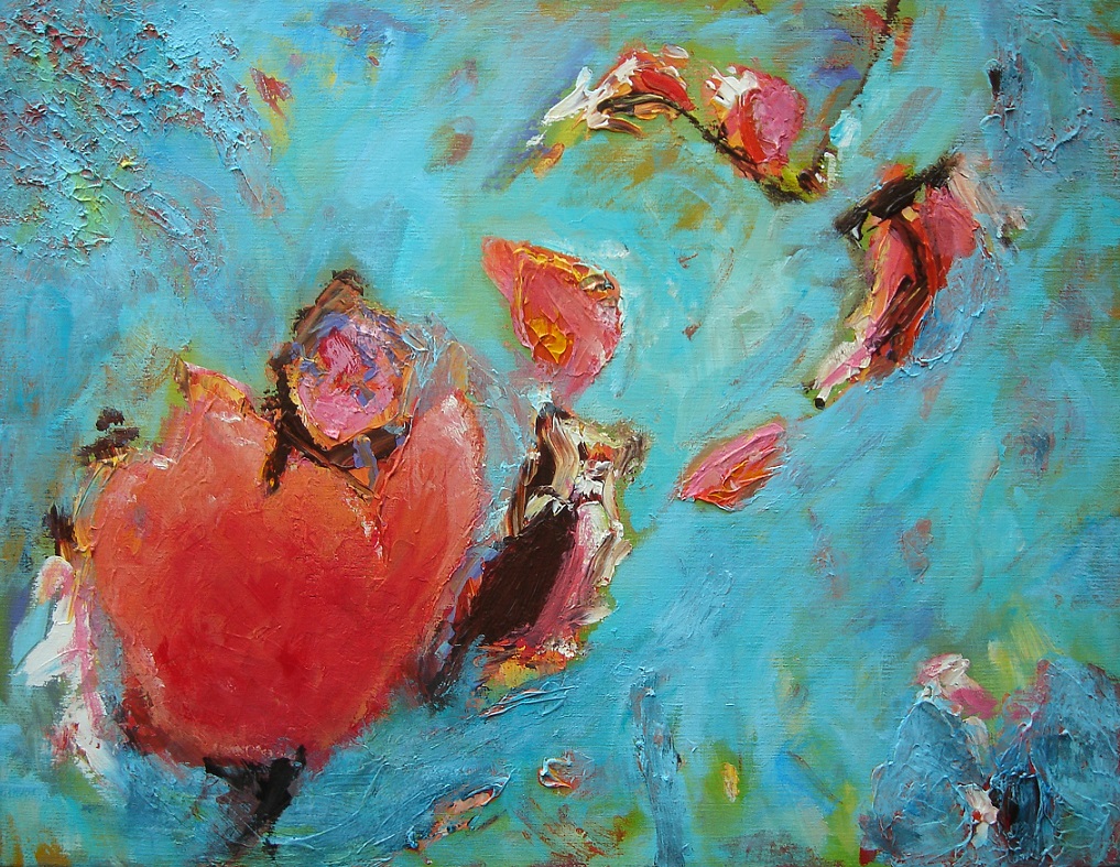 Bloemachtigen blauw. Modern/fantasie/abstract. Geschilderd in acrylverf met reliëf op linnen doek 70x90 cm.