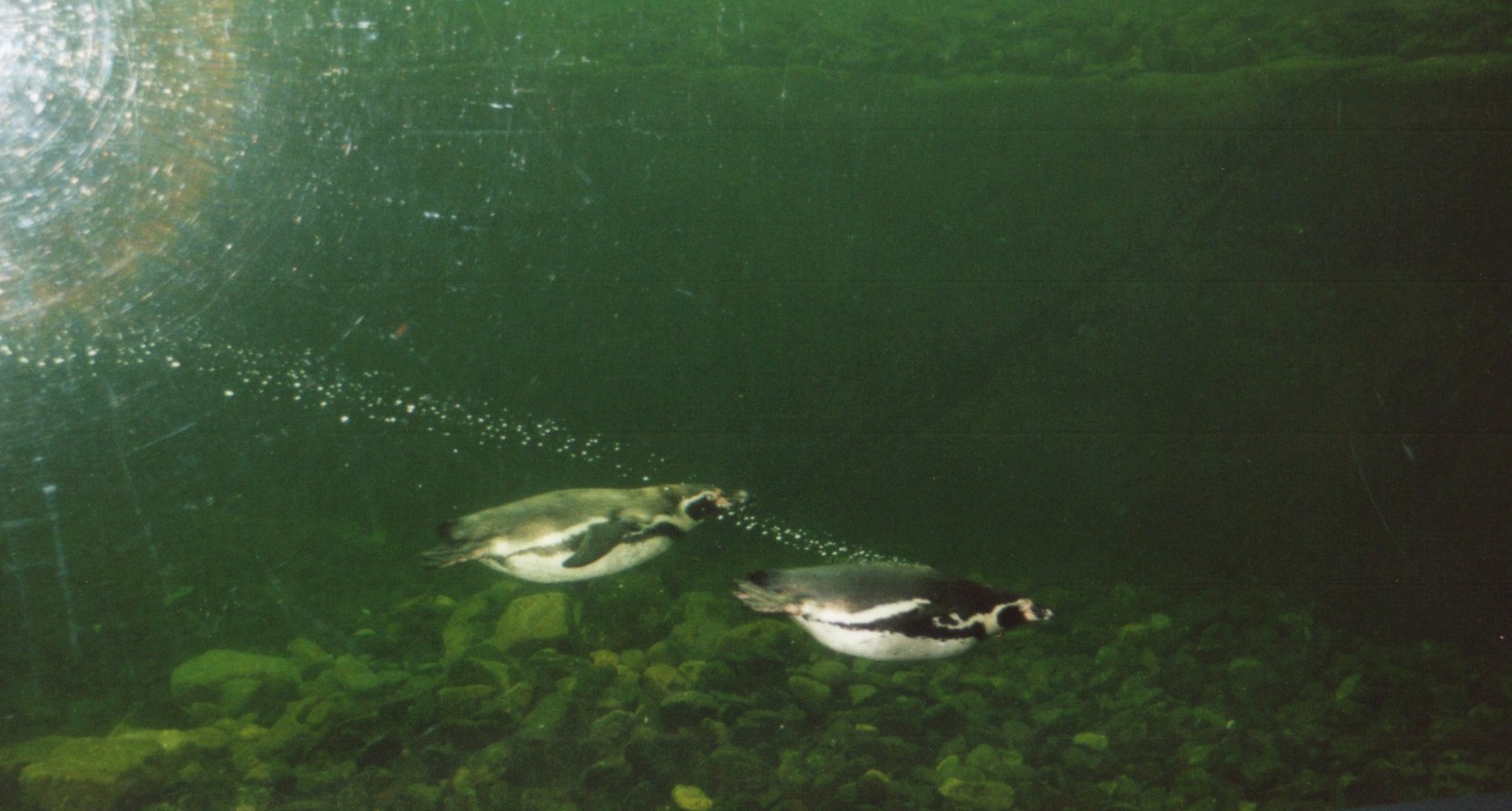 Duikende pinguins laten een spoor van lichtbellen achter. De weerkaatsing in het glas zorgt voor een effect wat overeenkomt met het logo van Atlantis!