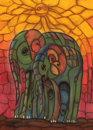 Oliefanten Groen Geel Rood Roze Lapjes Zon Kalf Kalje Oliefant Rhemrev
