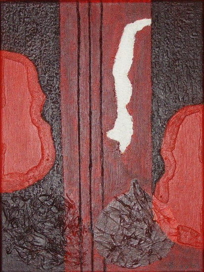 abstraherende voorstelling met diverse materialen in een rode baklijst