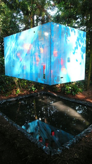 het totale kunstwerk in bos met reflectie ervan in vijver