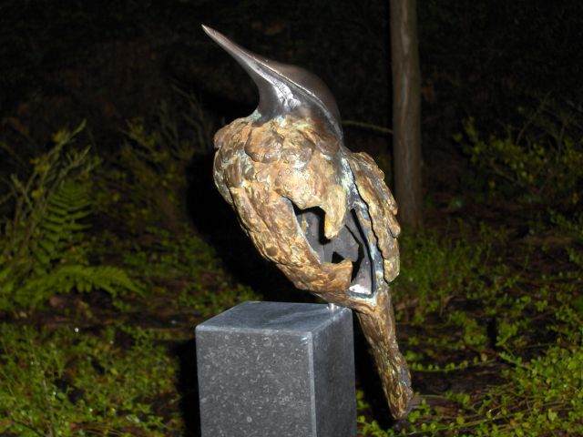 vogel in brons met diverse openingen waardoor er van alle kanten een andere aanblik ontstaat en het beeld een 'luchtig' karakter krijgt