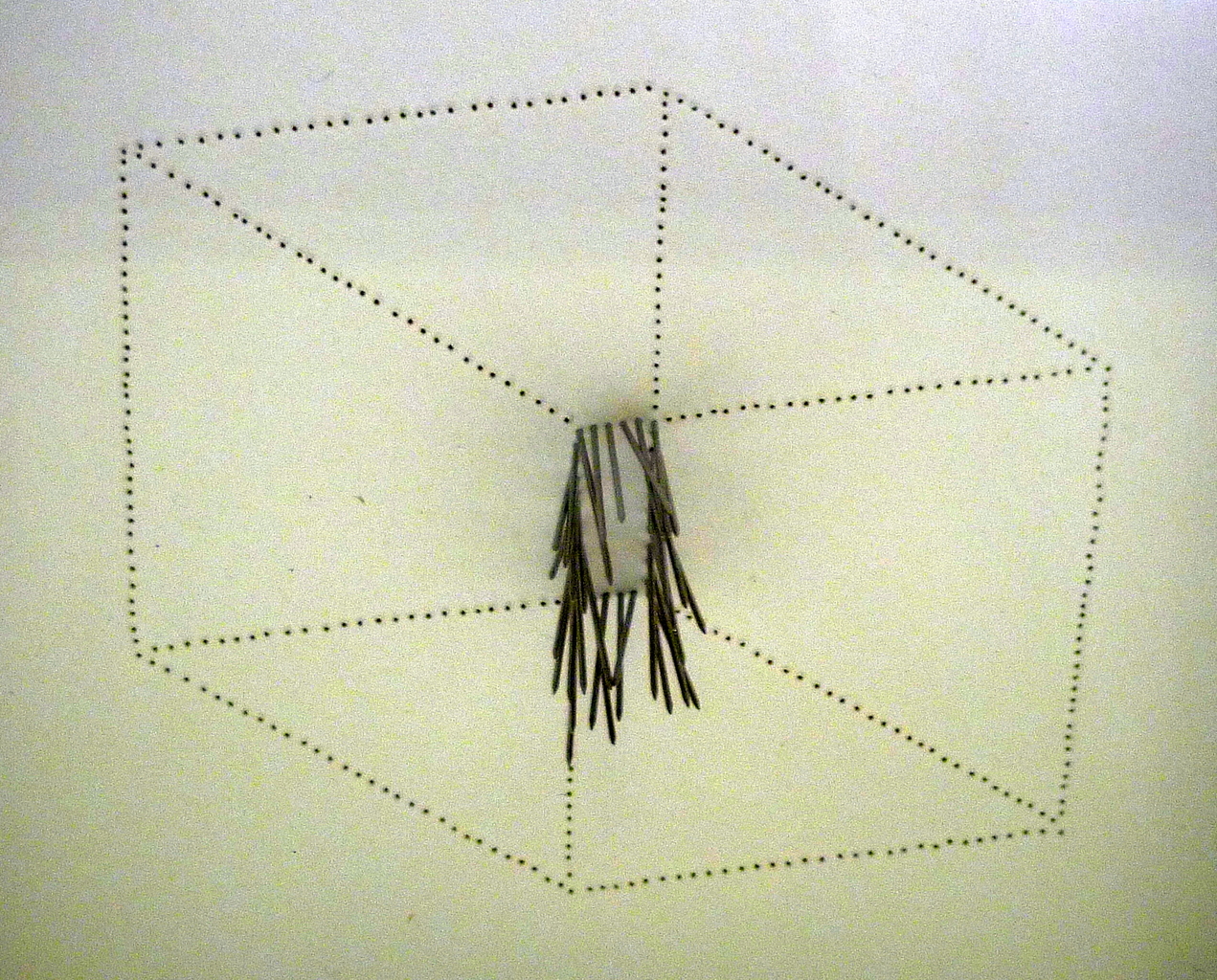 Door mijn ogen gezien, is de tastbare wereld opgebouwd uit puntjes. Vele bewegende puntjes, in verschillende dichtheid, veroorzaken vorm, maar veel minder vast dan je tastend zou voelen. In mijn werk communiceer ik deze waarneming.