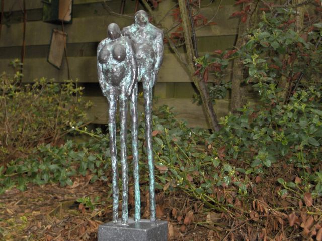 Man-en-vrouw-beeld in brons op sokkel van arduin(7x7x15). Geeft een beeld wat de tand des tijds met ieders lijf doet.