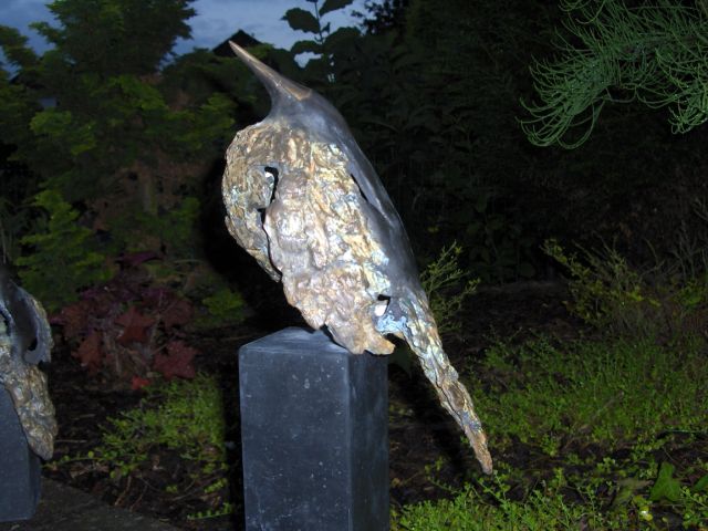 vogel in brons met openingen waardoor een 'luchtig' beeld ontstaat