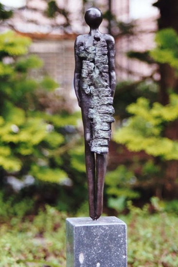 Vrouwenbeeld in brons deels bekleed met een boomschorsstructuur op sokkel van arduin (7x7x15)