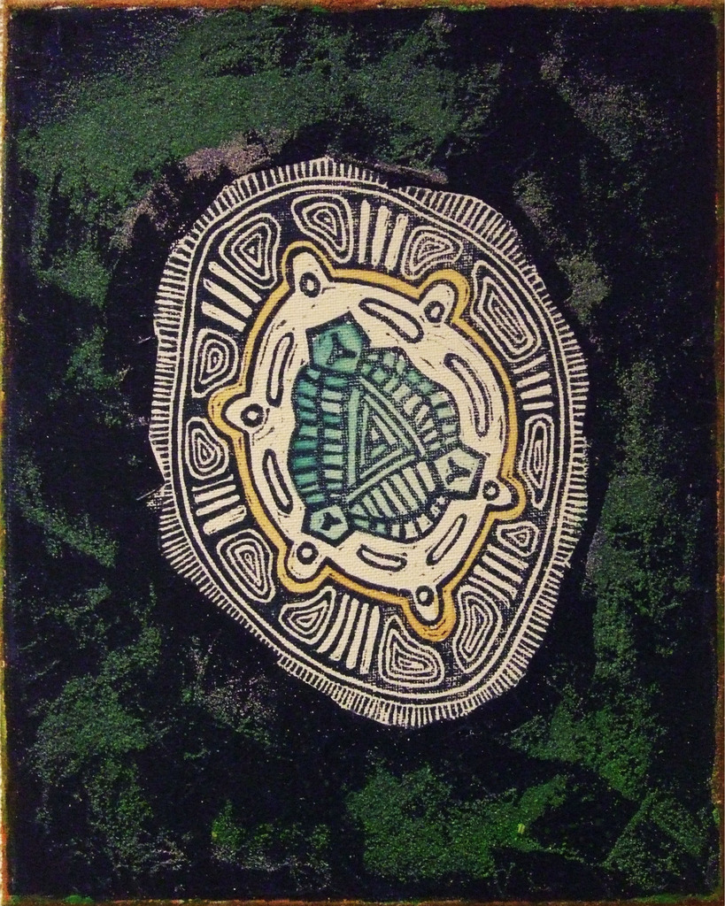 Linosnede/mixed media op doek (monoprint)
