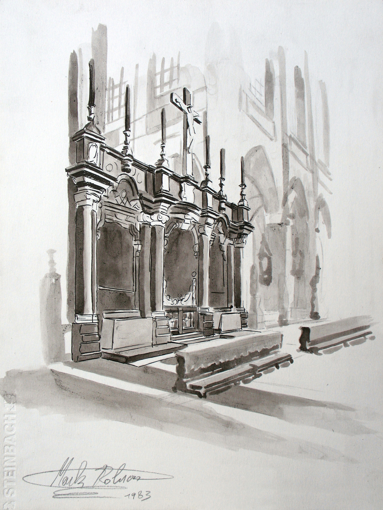 Studie in inkt en gewassen inkt van het bijzondere doksaal van de St. Jacobskerk te Antwerpen.