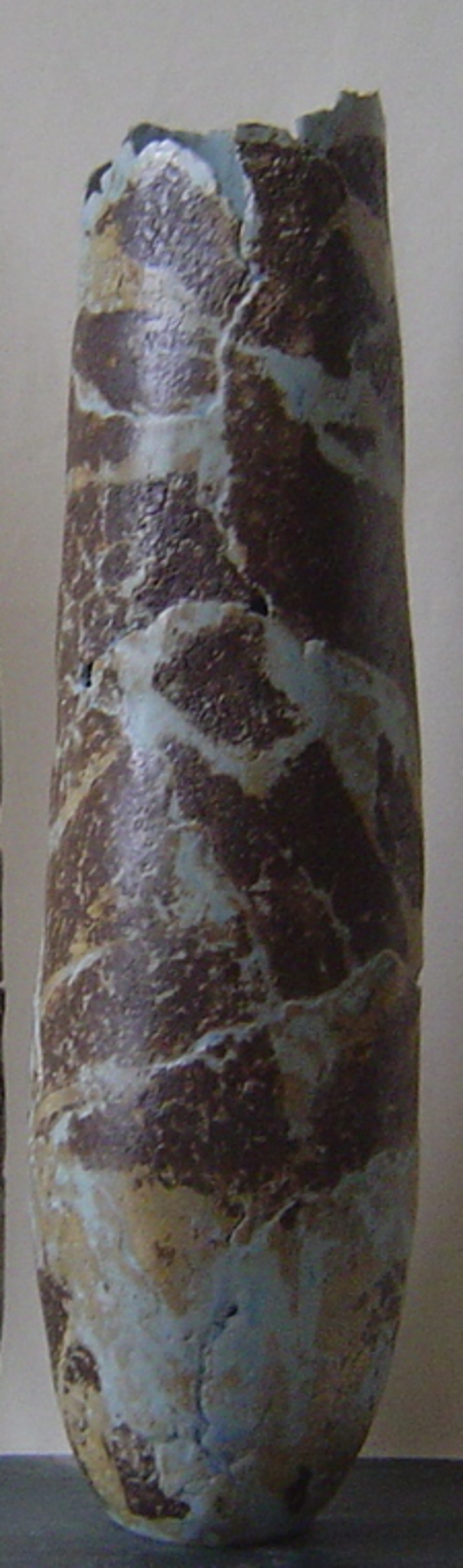 Vaasvormen gemaakt van lappen lichte klei met applicatie van donkere klei. Aan de buitenkant komen de kleuren van de klei door de dunne laag blauwe glazuur heen. Steengoed, geglazuurd - Te zien bij Galerie Kunststukken 101, Thomsonlaan 101, Den Haag (http://www.kunststukken101.nl)