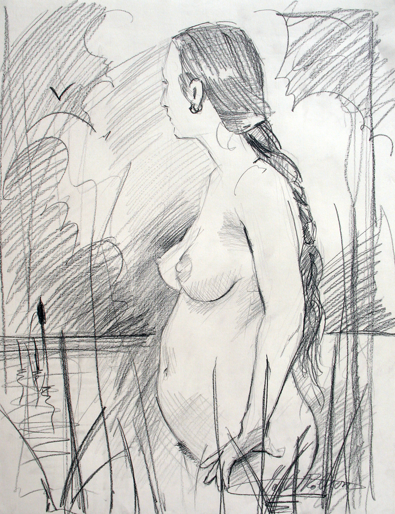Studie naar staand naaktmodel. Het imaginaire decor met wuivende riet en stemmige bewolking ontstond ter plekke. Pastelpotlood.