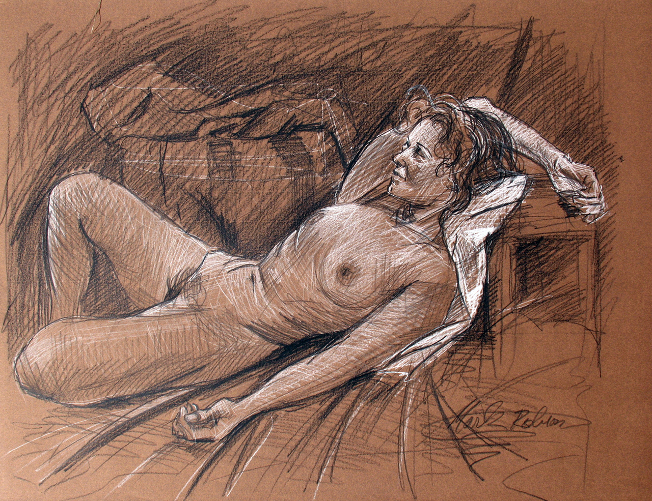 Studie naar relaxed op de rug liggend naaktmodel. Pastelpotlood op donkerbruine ondergrond.