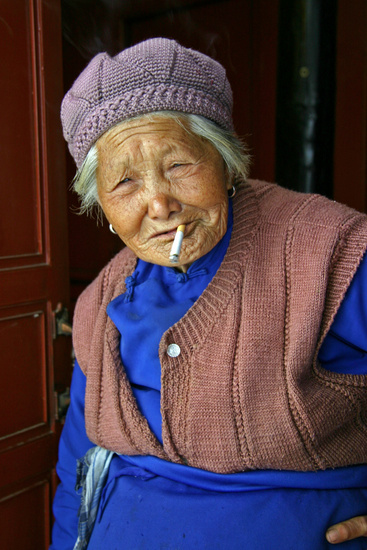 Een oude Chinese vrouw geniet nog steeds van een goeie sigaret.