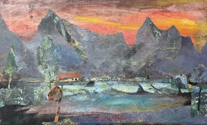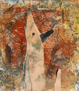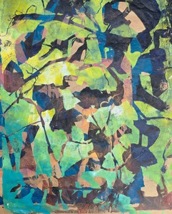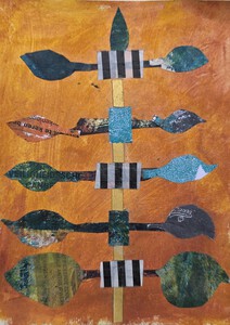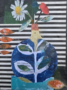 Vaas gebroken vorm, decoratie majolica en glazuur. Vissen, water, vogels, huizen en abstraherende lijnen,handgeschilderd, deels glazuur en transparant glazuur over majolica. Gebakken, deels geglazuurd, gebroken, beschilderd en weer samengesteld.