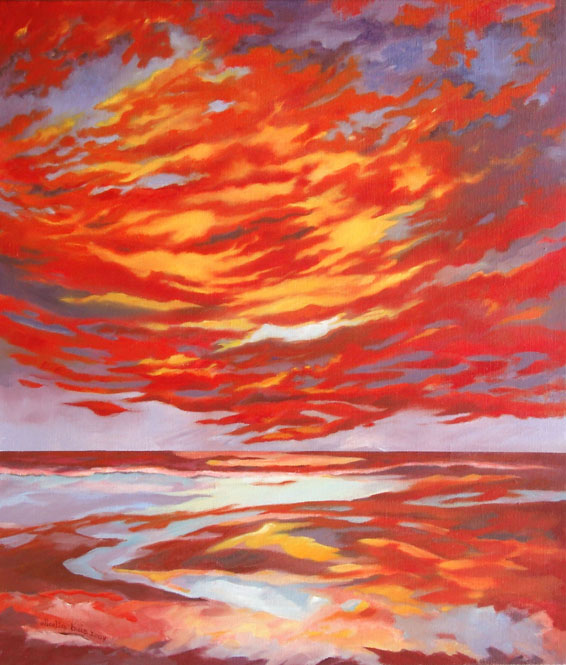 Impressie van een vurige zonsondergang vanaf het strand van Goa in India. Van het origineel is een hoogwaardige Giclée te bestellen voor E600,-.