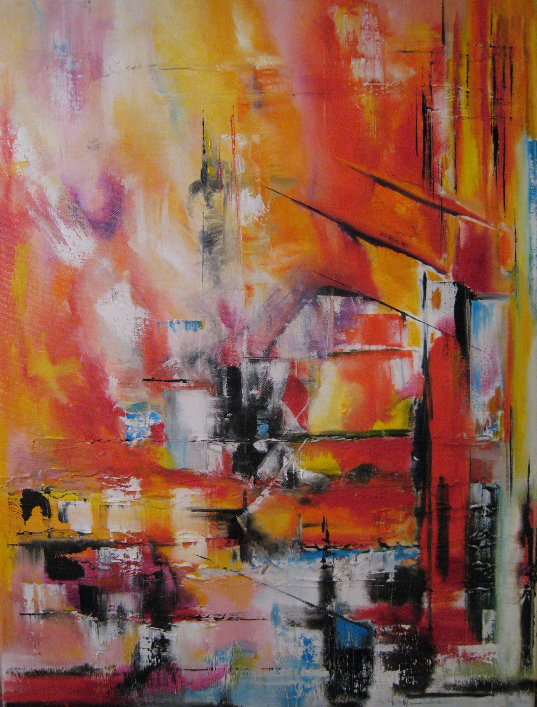 Abstract Rood Yellow Oil Olieverf Harbor Red Haven Kleur Boot Orange Zeilboot Colorful Contemporary Boat Boats Sails Sailing