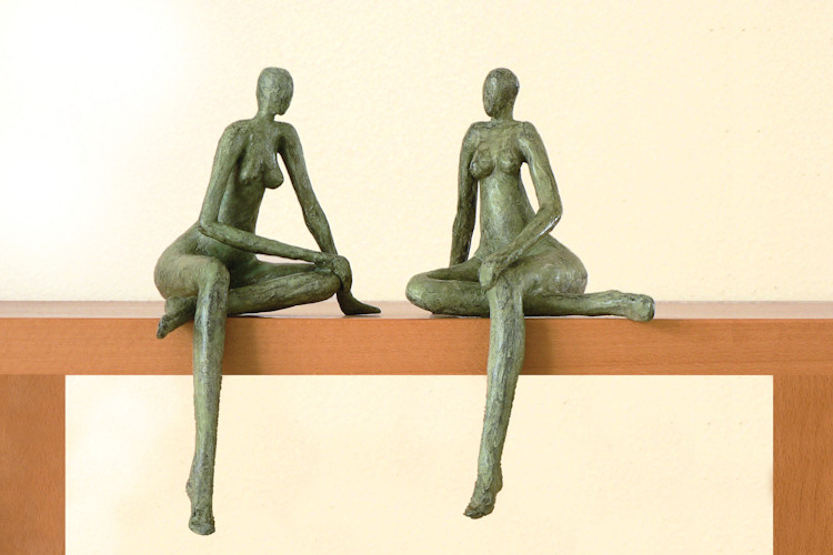 twee vrouwfiguurtjes in brons los of op open sokkel van roestig staal te koop.