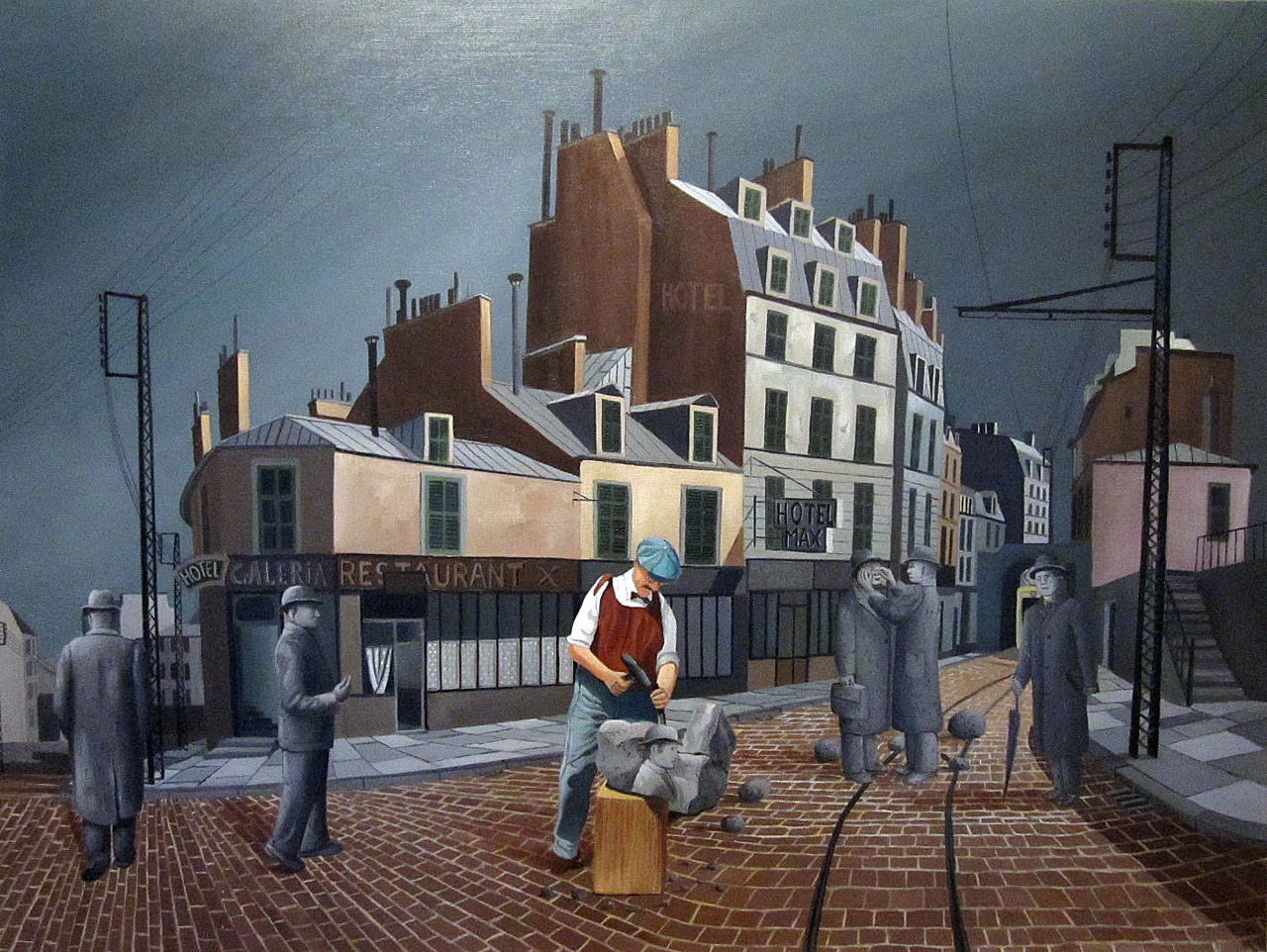 Het desolate karakter wordt hier geaccentueerd door de aanwezigheid van één mens van vlees en bloed (beeldhouwer die stenen figuren uitkapt). Deze stenen beelden blijken hun eigen gang te gaan in een omgeving die geen andere stervelingen kent. Er gaat absurditeit van dit werk uit of beter gezegd het absurde van het leven.
