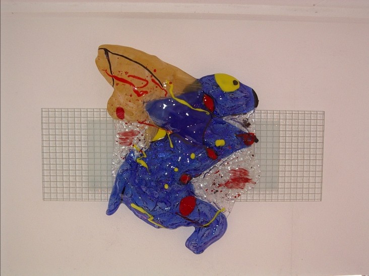 Wandpaneel van gefused en gevormd Spectrum glas verlijmd op draadglas