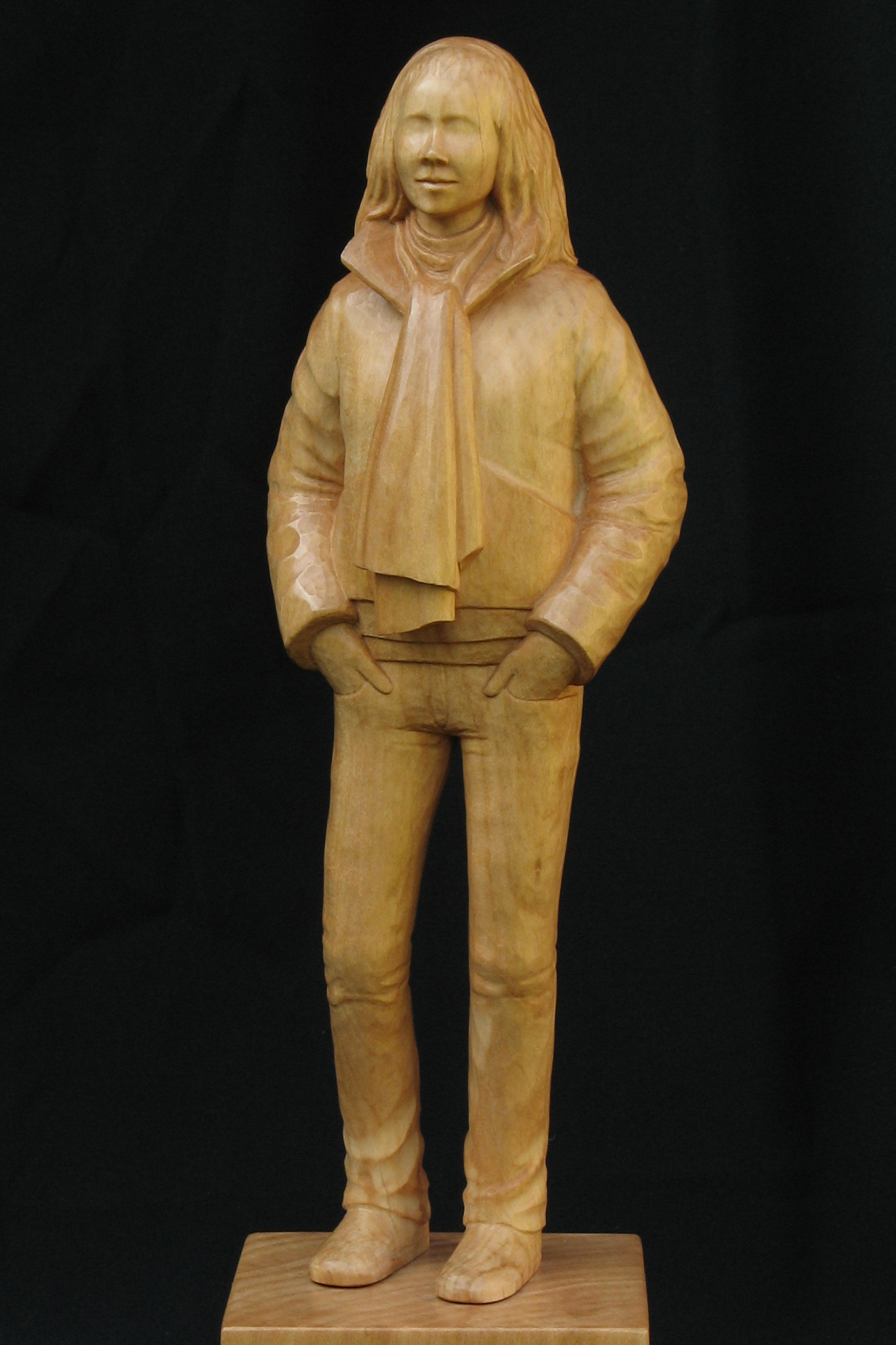 Een meisje van 14 jaar oud in haar winterjas - houtsoort: linden