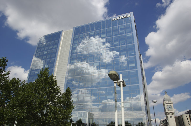 Foto genomen in Parijs van het Natixis gebouw. Een grote imposante glaspui met een mooie blauwe lucht met wolken.