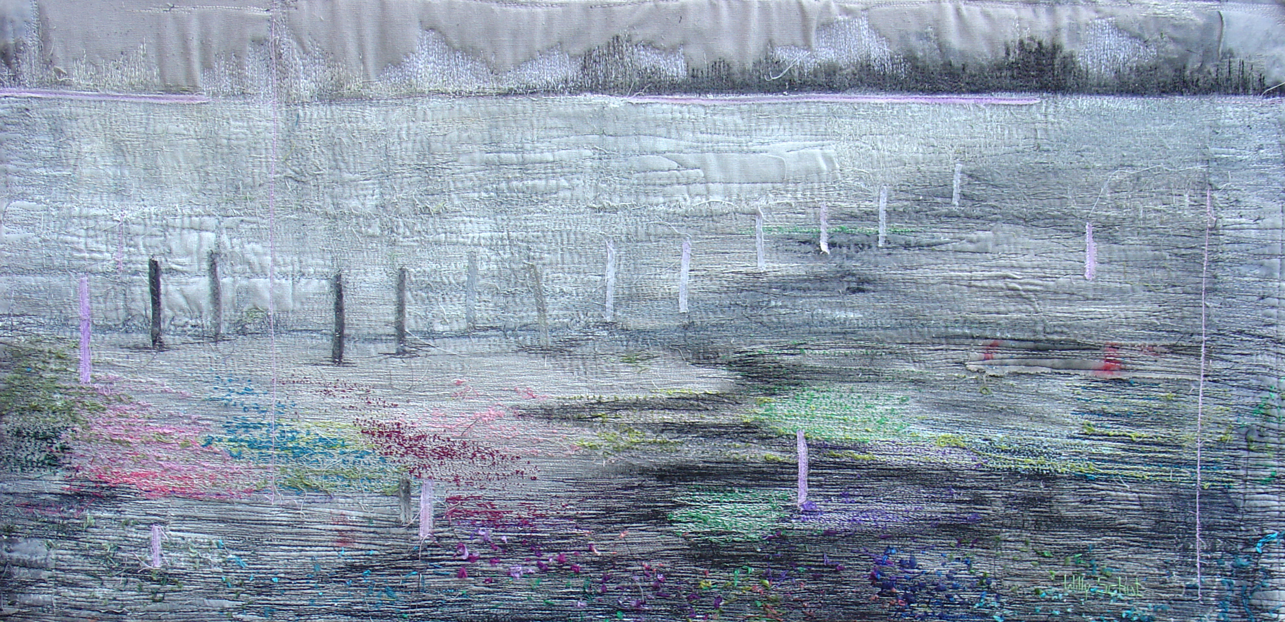 Machine-embroidery Machinaal-borduurwerk Grijs Zwart Landschap Realistisch Black Landscape Paint Palen Verf Grey