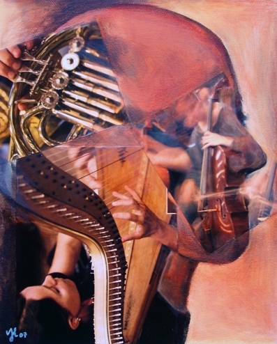 Hoofd vol en van muziek. Gemengde techniek: collage & acrylverf.