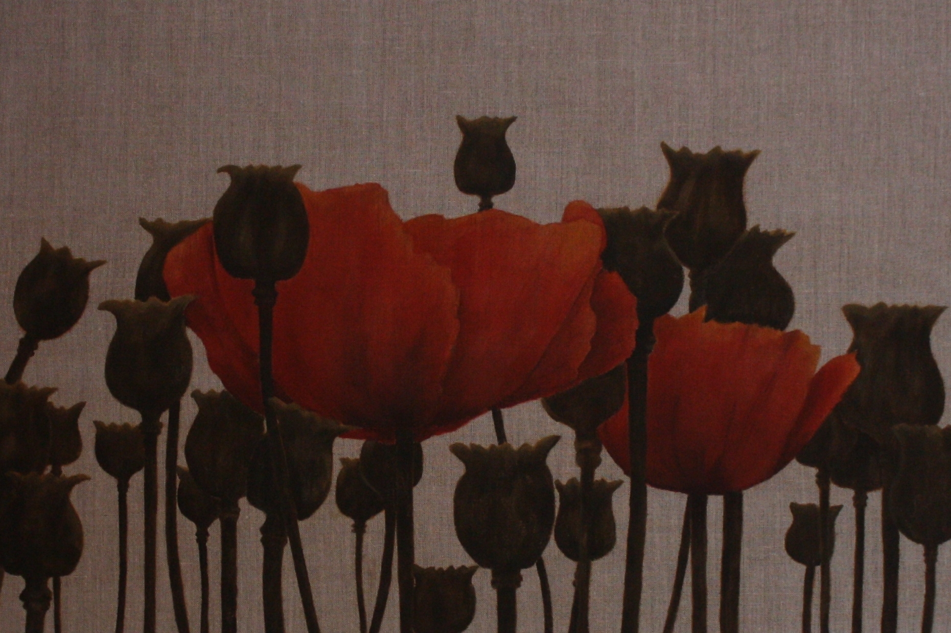Grote papavers omringt door de zaaddozen. Een sereen schilderij op onbewerkt linnen