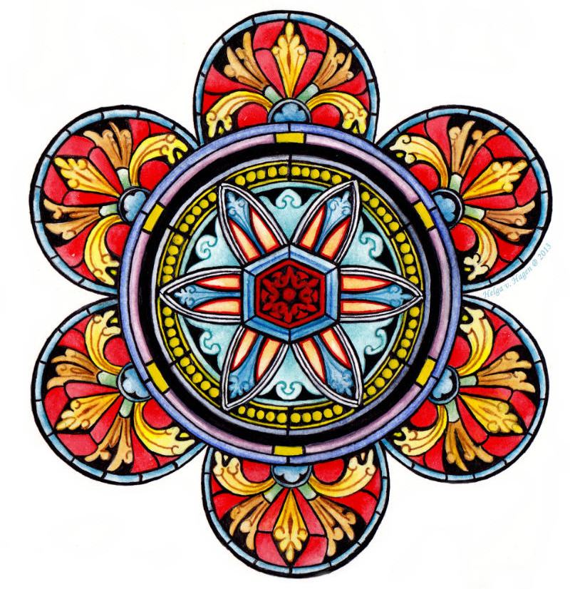 Geschilderd naar eigen foto. Roosvenster van de Basilique Notre-Dame d'Avioth.