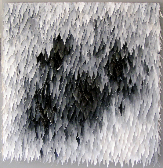 Wandobject bestaande uit beschilderde textiele 'snippers' gecombineerd met keramische 'scherven'.