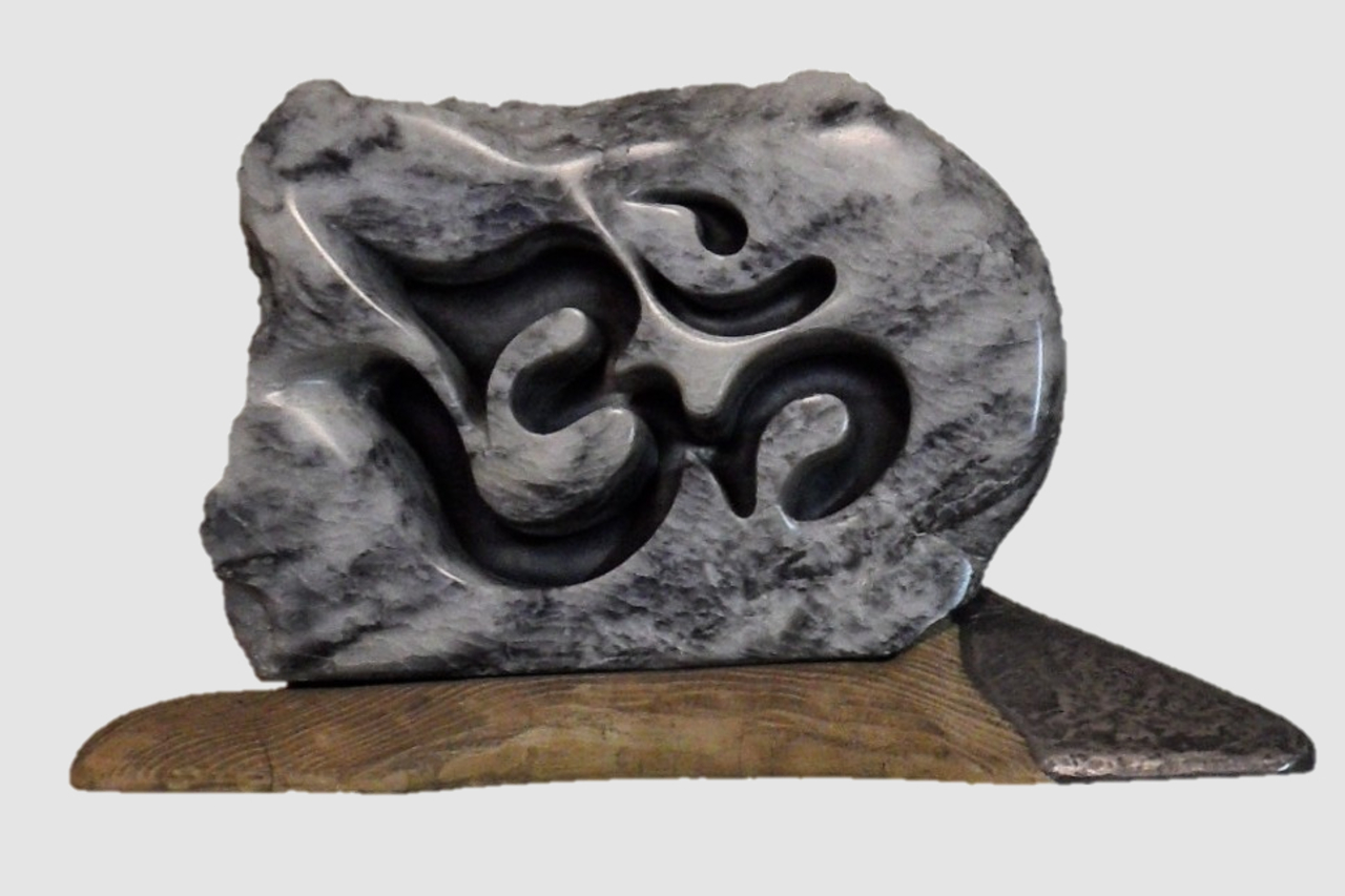 'Aum Sign 2' is gemaakt van steatiet geplaats op beuken en bekleed met lood. Het was een geschenk voor mijn zoon Xander bij de opening van zijn winkel in Venray. www.cadeautjesvanmoederaarde.nl