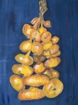 keukenschilderij van een streng knoflook hangend aan een blauwe wand, duo met uien