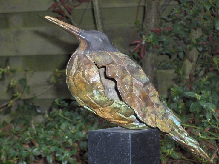 vogel in brons met diverse openingen waardoor een 'luchtig' karakter ontstaat