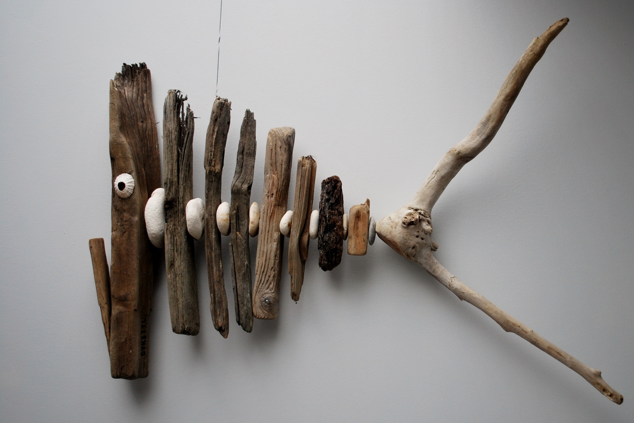 maakt al jaren houten beelden door natuurlijke objecten uit zee te koppelen. De beelden zijn ruw en puur.