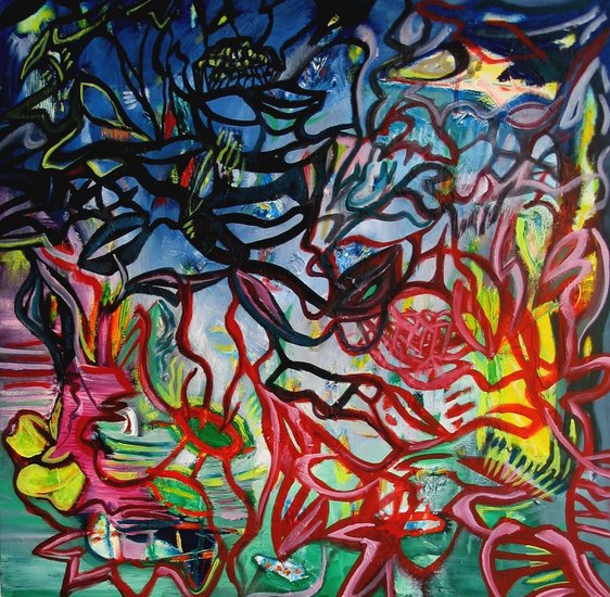 Bart van der Bom schildert abstract expressionistische schilderijen met figuratieve elementen.