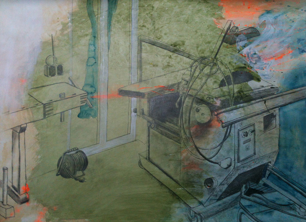 Mijn houtbewerkingsmachine getekend met potlood op achtergrond van acryl.
