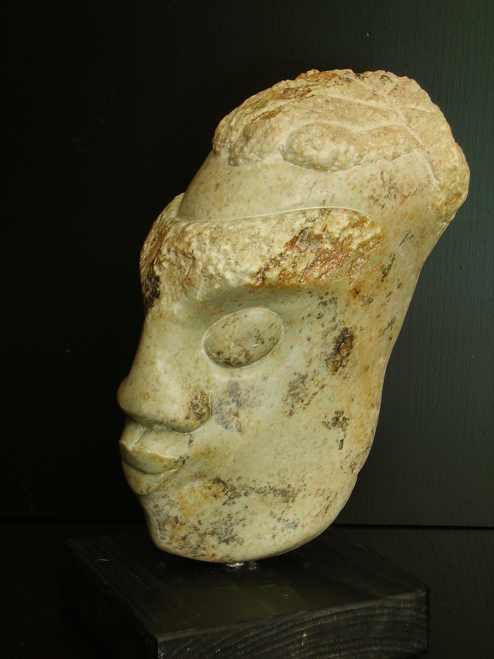 Verbeeld een afro gezicht. De ruwe steen is zichtbaar in de wenkbrauwen en het kapsel