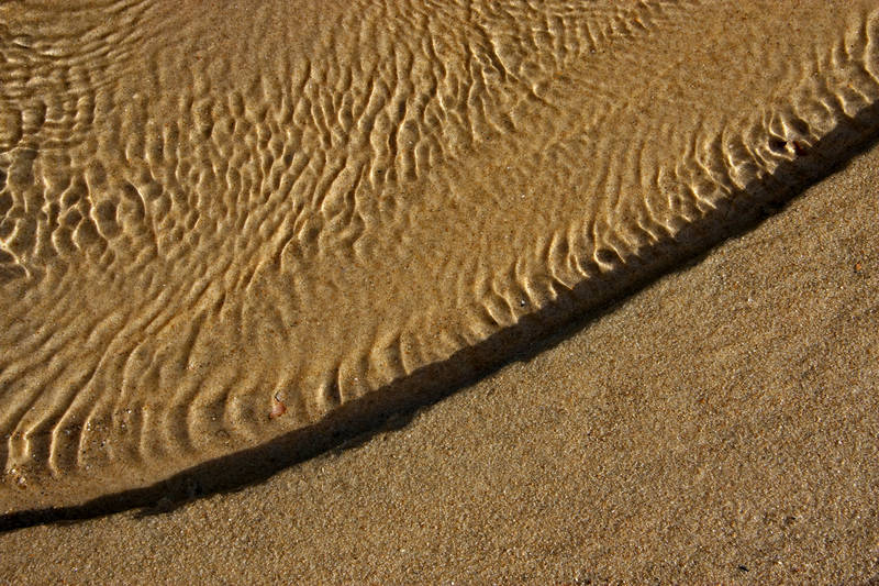 Het bij eb terugtrekkende water slijpt vormen uit in het zand van het strand