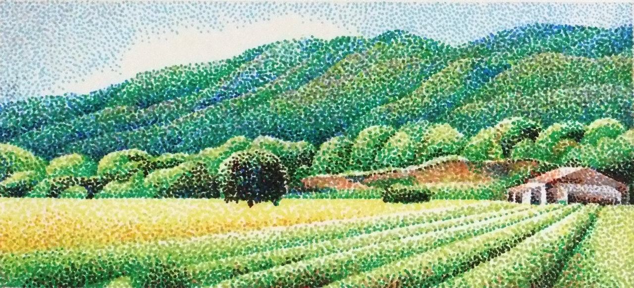 Maakt voornamelijk landschapselementen met voornamelijk bomen als thema en inkt en kleurpapier