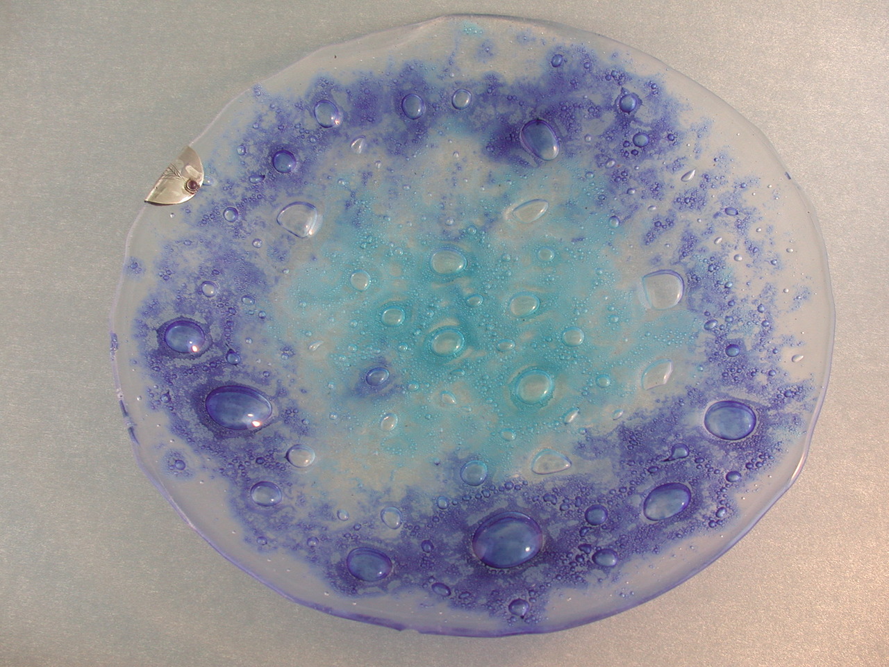 Met een speciale techniek is in deze schaal bubbels gestookt in het glas. Ik ben heel blij met het resultaat, 1 bubbel gaf in het randje een oneffen aanzien, wat ik niet mooi vond. Omdat ik ook de edelsmeedtechniek beheers, heb ik van zilver een mooi detail hiervoor gemaakt. En dat geeft net iets extra's en sjieks..