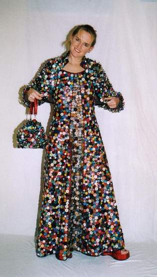 mijn werk is het maken van unieke kleding van materialen die daar niet voor bedoeld zijn, zoals van voetballen, cd's, sleutels, munten, flesdoppen enz.enz.