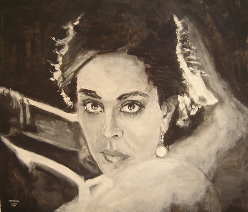 Portret "Carmen" in zwart wit grijs, geschilderd in acrylverf op linnen doek 70x80 cm.