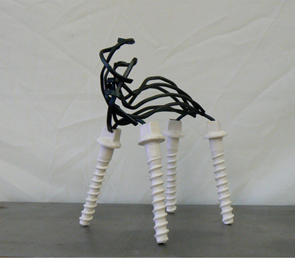 Een oude metalen houtfret heb ik uitgevoerd in keramiek en gecombineerd met staal dat ik tot een dynamisch geheel heb gesmeed. Het is als een bewegelijk dier dat zeer stevig op zijn poten staat.
